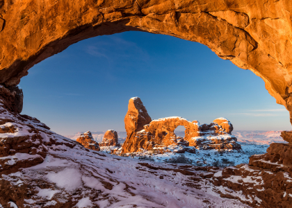 拱门国家公园的北窗框景中的炮塔拱门, 犹他州, 美国