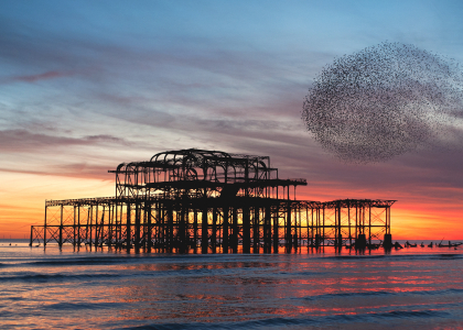 椋鸟群在布莱顿西码头废墟上空盘旋, 英格兰