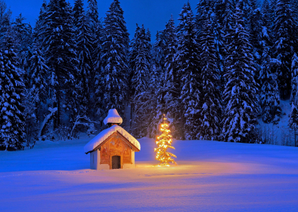 巴伐利亚阿尔卑斯山脉的雪中教堂与圣诞树,德国