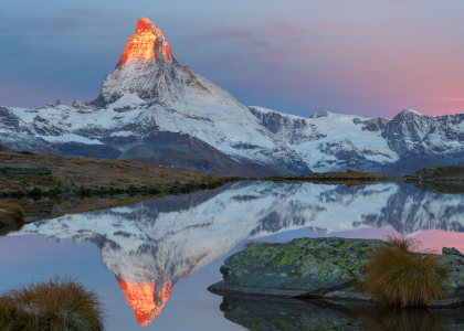 日出时分,马特洪峰的倒影映照在斯特利湖中, 采尔马特, 瑞士