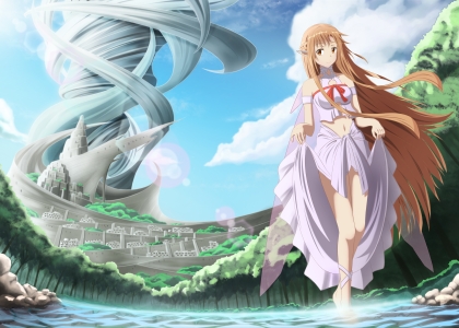 在蓝天白云的森林河流边、长发可爱动漫少女、大长腿性感大胸带来清凉...