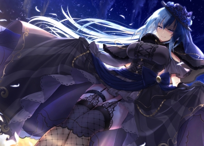 蓝礼裙大胸动漫美女夜晚星空中望着白花的大长腿丝袜美女的4K高清动漫...