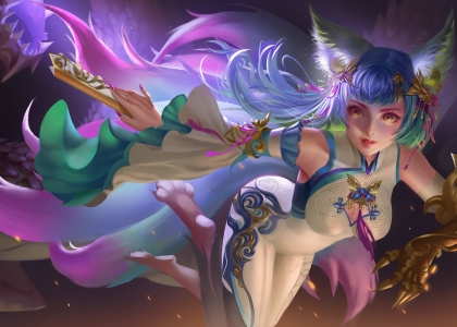 中国风古装3D古风动漫美女、狐狸尾巴妖狐妲己飞舞天空的5k动漫壁纸