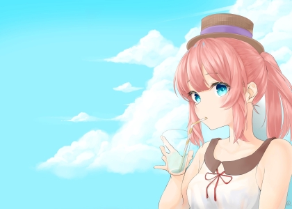 夏季阳光下动漫女孩带着帽子拿着玻璃杯喝汽水、红头发蝴蝶结上衣的动漫女孩4k...
