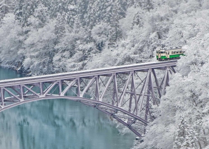 日本 、【今日大寒】一列穿越三岛村附近只见川的火车