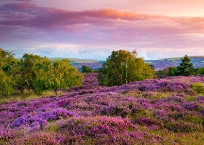 英国多塞特郡 、斯塔德兰附近荒野上丛生的紫色和粉红色帚石楠