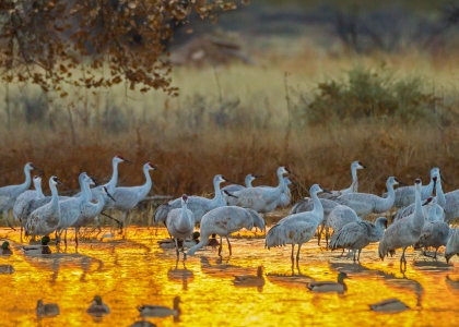 野生动物保护区中的沙丘鹤和野鸭、美国新墨西哥州