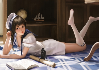海军服动漫美女、白色袜子的美腿美女比翘殿更诱惑、航海望远镜、地图已不在少...
