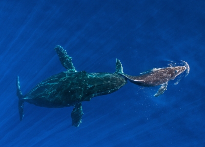 座头鲸妈妈将她熟睡的幼鲸推到水面、夏威夷毛伊岛